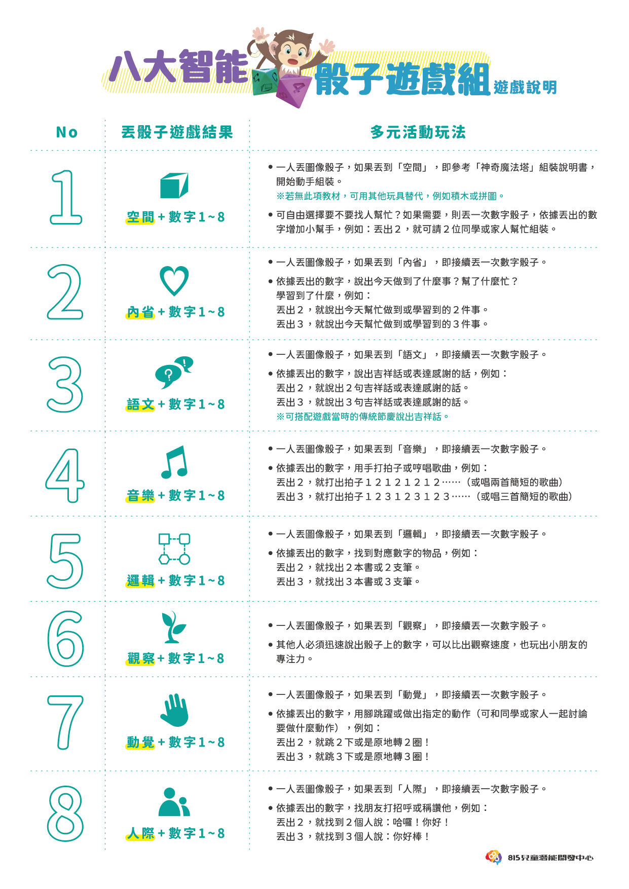 結合團體學習或居家遊戲的趣味教具,從八大智能活動出發,訓練幼兒的專注觀察、邏輯思考、表達溝通、肢體動覺等多元能力。