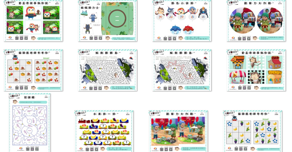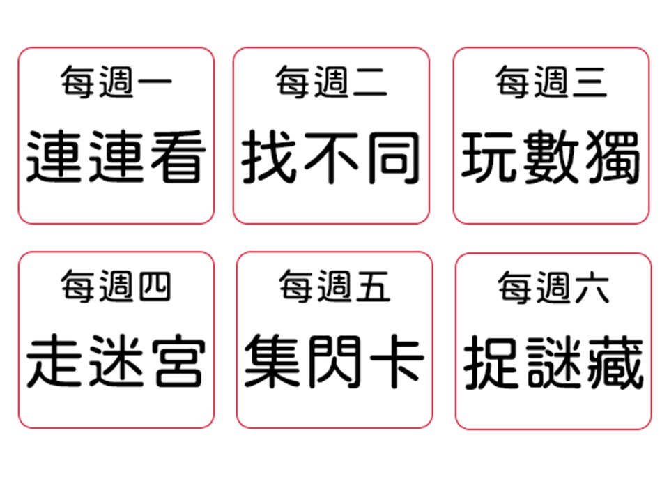 現玩現學,陪伴孩子開心每一天,這次的學習型態多元,一週六天不同學習互動型態,從連連看、找不同、走迷宮,到最燒腦的數獨,學習閃卡的收集,還有結合解謎與空間智能的捉"謎"藏任務單!