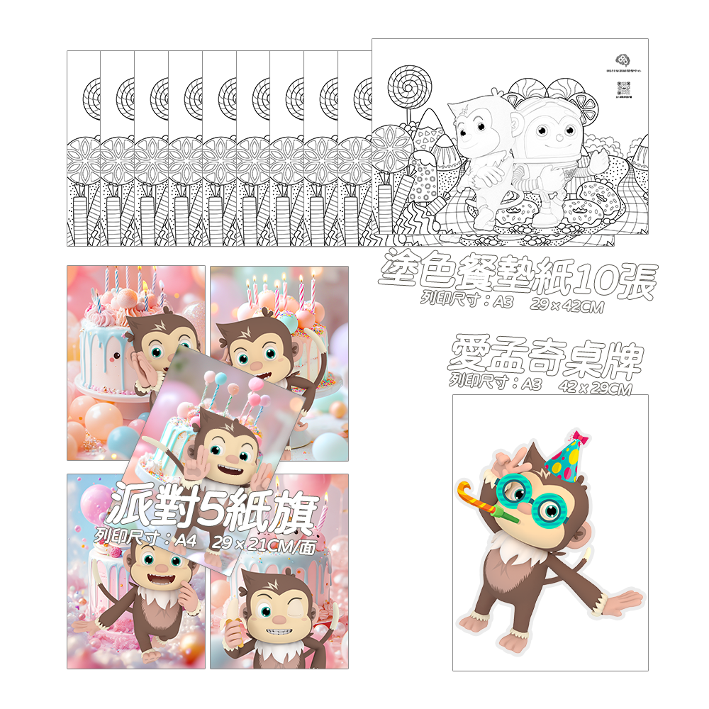 - 桌面立牌:可愛的愛孟奇造型立牌,放置在桌面上,瞬間提升派對氛圍!(尺寸在A3以內) \t