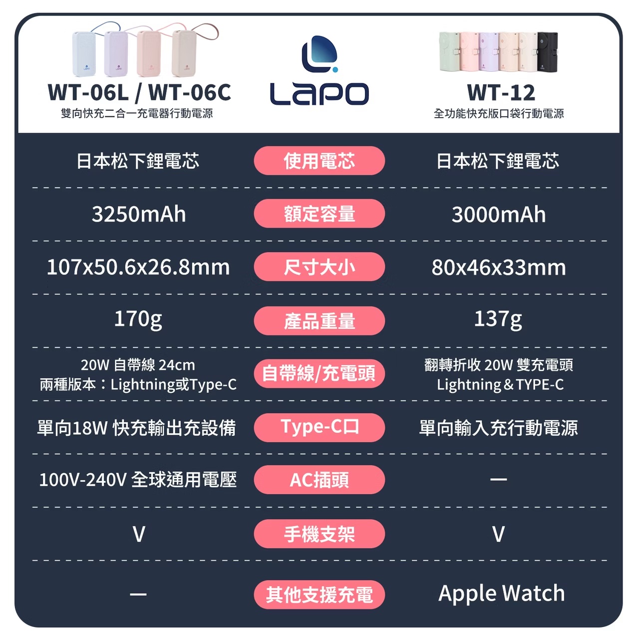LaPO 快充口袋行動電源 WT-12CL 幻紫色