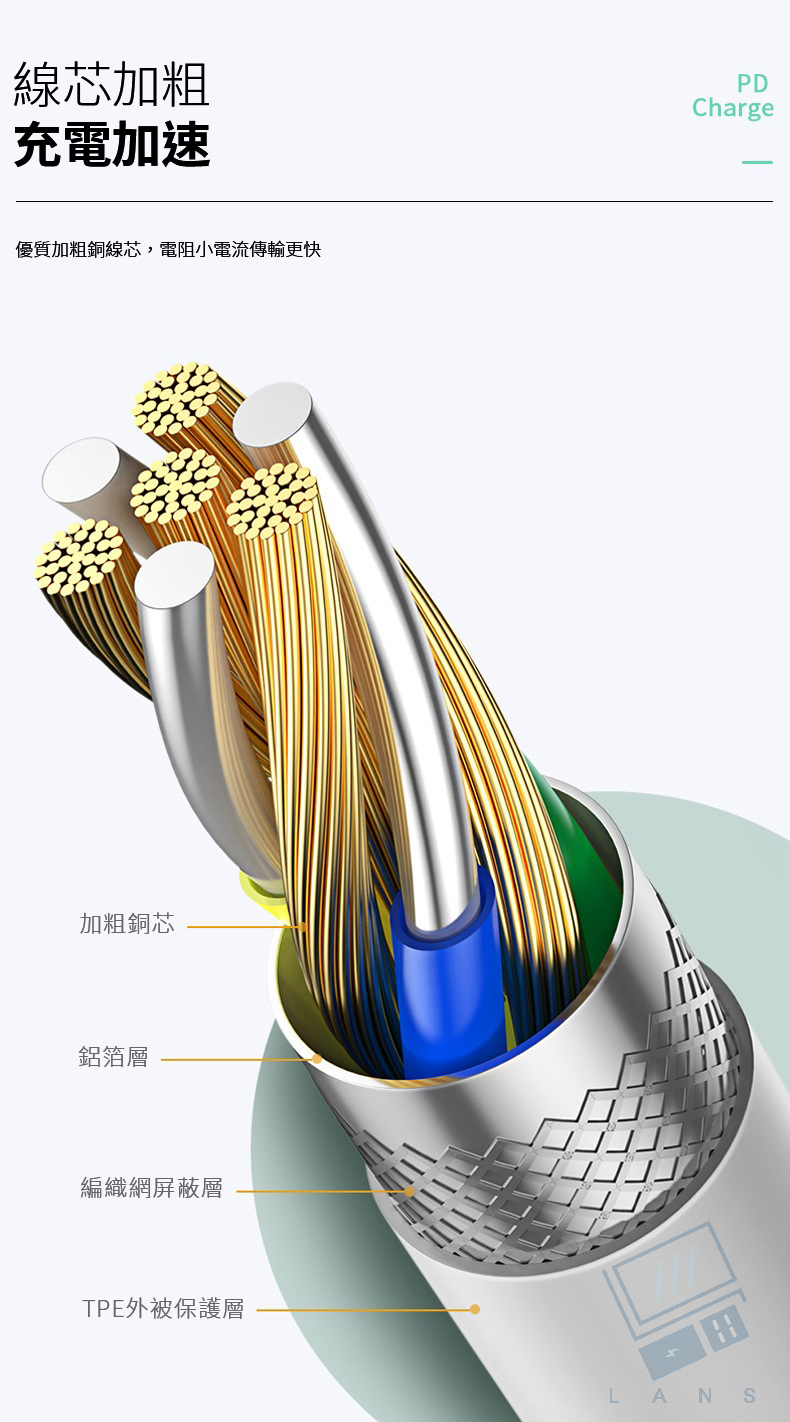 【樂樂】冰晶頭PD60W彩色编織快充線 Type-C to Type-C(低溫快充 充電數據線 智能控溫 1入組 保固1年)