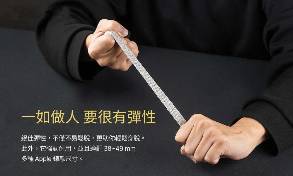 A1:Apple Watch 錶款38/40/41公釐的錶帶藉由錶扣調節長度適合130-180公釐的手腕圍;Apple Watch 錶款42/44/45/49公釐的錶帶則適合130-210公釐的手腕圍。