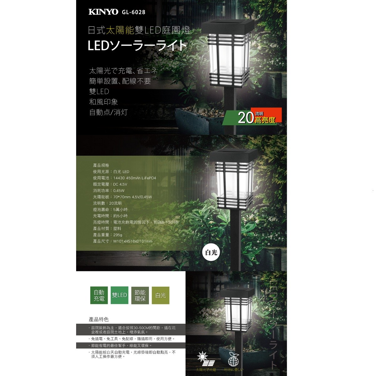 此款【KINYO 日式太陽能雙LED庭園燈 GL-6028】使用太陽能板白天自動充電,光線昏暗即自動點亮,綠能又環保;採用LED燈,節能免插電,省電的最佳幫手亮燈時間:電池充飽電的情況下,約為8-10小時。免插電、免工具、免配線,隨插即用、使用方便