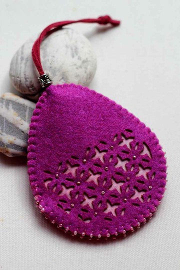 採用水滴型設計,窗花圖樣為台灣古厝窗花為靈感,鏤空部分採用雷射雕刻,底部透色布為手染布,整個商品採用手工縫製而成。利用麂皮繩的牽動,拉動裡邊的鑰匙圈作長短伸縮設計,將鑰匙藏至鑰匙套內,可當吊飾,富典雅精緻之美感效果。產品編號: HD11012-22尺寸:\t8.5X10.5CM材質:\t混合色斯丁呢〈似不織布〉,棉布、麂皮繩製造:\t台灣顏色選擇: 桃紅色、紫色、橄欖綠色(不可水洗)