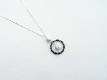 Gemming Geometry Collection **【產品編號】**SRGG-NE11**【材質與尺寸】**+ 天然黑膽石 (Hematite) 手工圓環約 21 mm,**由師傅手工製作的圓環本身很脆弱,請小心呵護,禁摔。**✪ 黑膽石學名赤鐵礦,外表呈現黑鋼或銀灰色,我們所使用的黑膽石產自巴西,由於開採量大為減少,目前幾乎被人造鐵膽石 (Hematine,大量應用於珠寶製作) 所取代,兩者在外觀上幾乎一模一樣,皆因含鐵所以遇水易產生鏽斑,所以沾到水記得擦乾以免生鏽囉! + 白紋石 (Howlite) 圓珠約 6mm、8mm。+ 項墜全長約 3.5 cm。+ 925 純銀小立方體鍊,含扣全長約 16 吋。https://lh3.googleusercontent.com/-fXNkfPX3ySo/VcQmz_u4QgI/AAAAAAAACYI/S8bS1Xb9TjA/s640-Ic42/SRGG-NE11_fit%252520%252528%2525E8%2525A4%252587%2525E8%2525A3%2525BD%252529.JPGhttps://lh3.googleusercontent.com/-uvr8Fat7nhw/VbnR0XhnKgI/AAAAAAAACSM/6MYuEVWBUYM/s640-Ic42/SRGG-NE11_1%252520%252528%2525E8%2525A4%252587%2525E8%2525A3%2525BD%252529.JPGhttps://lh3.googleusercontent.com/-B4fkcxft6i0/VbnRyqaBfrI/AAAAAAAACRo/Ps0IFWKl-Mg/s640-Ic42/SRGG-NE_EA11%252520%252528%2525E8%2525A4%252587%2525E8%2525A3%2525BD%252529.JPGhttps://lh3.googleusercontent.com/-vvRtOoDX2JY/VbnR09ZuAJI/AAAAAAAACSQ/S34R0OlkxAQ/s640-Ic42/SRGG-NE11_4%252520%252528%2525E8%2525A4%252587%2525E8%2525A3%2525BD%252529.JPG**【購物之前】**+ 工作室平常有既定工作行程,如果發問,我們會儘量於 1- 2 個工作日內回覆 (不含例假日),手工訂製首飾製作出貨時間約為 7 - 10 個工作日 (不含例假日,不含物流),請您耐心等候,也非常謝謝您的體諒!+ 照片皆為實品拍攝,因電腦顯色、拍攝光線、或個人觀感定義不同,難免有色差問題,商品皆以實品為主。+ 天然石多少有冰裂紋、雲霧、及色帶變化,每顆顏色與切磨形狀亦無法像人造的一模一樣,每顆天然養殖珍珠的顏色形狀也都有些許差異,因此成品所使用的天然半寶石及珍珠,與照片中的可能不盡相同,但這也是天然素材獨特的個性魅力,同一件飾品我們會盡力挑選顏色及品質級數相當的天然石做搭配,能接受再下訂喔!+ 純銀、銅材質會隨時間以及使用者佩戴方式而產生氧化,不能接受者不建議購買。如要減少氧化情形,請您按照我們提供的飾品保養方法保養,其實銅氧化後所散發出低調內斂的氣質也是很迷人的!+ 大部分手鍊款式提供尺寸選擇,依設計不同,用增減小珠、扣環、或金屬鏈的方式製作;如需客製修改長度,編排可能依長度有所調整,但以不影響原設計為原則。+ 購買前請務必確認手圍,成品之手圍依您提供的數字正負誤差 0.5 cm 以內屬正常,不會有太大影響。+ 因珠寶首飾均為客製貼身物品,除了新品瑕疵、寄錯商品、或運送過程中有損壞者,不接受退換貨。**【飾品保養】**+ **配戴建議**:任何首飾一律不建議戴著沐浴、泡湯、游泳、運動,避免接觸溫泉、海水、游泳池氯水、清潔劑、或其他化學物品。著裝時,配戴飾品應為最後一個步驟,應於化完妝、擦完乳液、噴完香水和髮膠後再配戴首飾。更衣或入睡前,應先將首飾取下,避免飾品因不經意的拉扯碰撞而斷裂或脫落遺失。+ **日常保養**:不配戴時,可用棉布或眼鏡布輕擦表面,清除水份和污垢,再放入密封的夾鍊袋中,避免與空氣接觸氧化。如果首飾沾染汗水或化妝保養品,建議先用清水沖淨、擦乾、風乾,再放入夾鍊袋中。+ **氧化處理**:如果銀銅飾品有硫化或氧化變黃發黑跡象,可用濕潤的軟毛牙刷沾牙膏或潔牙粉輕刷表面,以清水沖淨、用軟布或紙巾吸乾水分、並徹底風乾。如果是高拋光的飾品,例如戒指表面,要特別小心牙刷刷頭或牙膏中的研磨物質,可能會刮花飾品表面 – 使用手指或極軟的牙刷作為工具,不要選用具美白效果或明顯研磨顆粒的牙膏。也可用拭銀布、擦銅布擦拭表面,若擔心拭銀布、擦銅布上的化學乳劑造成皮膚過敏,配戴前可以清水沖淨並擦乾。**基本上,我們自己的純銀銅飾品只要有黯沉現象,就會擠點牙膏在手上沾些水,輕輕搓揉金屬部分,飾品便可恢復原有的金屬光澤,這個小秘訣也適用於 K 金及包金首飾!** + **K金飾品**:配戴後的金飾及鑲嵌寶石可能因汗垢或灰塵的沾染而失去光澤,此時可將金飾置於加入中性清潔劑的溫水中浸泡清洗,或用軟毛牙刷沾取中性清潔液 (如中性洗碗精、肥皂水) 輕刷台座底部及鑲鑽細縫處,再用清水沖淨並拭乾。+ **純銀飾品**:純銀的硬度較低,請避免拉扯或重壓凹折,其最佳保養方法是經常配戴,因人體油脂可使銀產生自然溫潤的光澤。銀飾如採特殊硫化燻黑處理,請勿過度擦拭,以免黑色設計效果消失。最好別使用具腐蝕性的洗銀水,使用過後反而會更容易氧化。+ **黃銅飾品**:銅飾氧化變黑,也可擠檸檬汁加水 (1:1 比例) 浸泡清洗。如果銅飾有結合天然石或珍珠,請勿直接丟進檸檬水內,可用厚紙巾、化妝棉、或棉花棒沾檸檬水,只擦拭銅的部分。+ **珍珠飾品**:珍珠硬度低,不宜與其他飾品一起存放,以免互相碰撞刮傷表皮。避免碰酸,配戴後請使用柔軟的棉布拭去汗水和污漬。若真需要清洗,請使用清水或中性肥皂水清洗,並擦乾風乾,不可用牙膏、拭銀布清潔。+ **珊瑚飾品**:珊瑚和珍珠一樣硬度都很低,因此和珍珠一樣需分開保存,平日可將卸下的珊瑚飾品先以清水沖淨,再用乾淨柔軟的棉布輕輕擦乾,以棉布的乾淨處沾取嬰兒油擦拭珊瑚表面,最後放置於陰暗處收藏,並避免撞擊或長時間曝曬在陽光下。