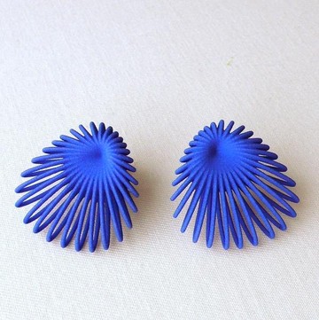 獨特的形狀,輕巧,引人注目。適合多種風格的服飾。3D打印機所製造的。材料是塑膠。可以用水清洗華麗的設計獨特,輕巧,而有立體感的耳環耳釘或耳夾,可以選擇。請在訂購時,聯絡我們。inspired by shell fish,this pair of lovely earrings is part of a series composed of concentric linework, reminiscent of sea shells.a very simple yet very pretty designimpressive and stylish, yet not overly outlandish.it is lightweight and easy to put on.this item comes with options of clip-ons with adjustable screws or rhodium plated ear studs/posts.they are made in nylon plastic. We created the design and had it 3D printed in Holland.the vibrant royal blue jazzes up simple outfits of basic blacks, whites or grays!