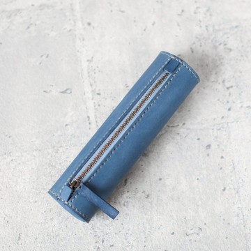 全手工灰藍色植鞣真皮圓筒筆袋