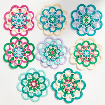 這是一款由紙張裁切、組合而成的花朵造型貼紙。每一個都是手工精心製作。65mm 8入可用於相冊、賀卡、剪貼簿、拼貼等各式裝飾。