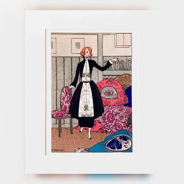 藝文月刊《La Garlande》介紹_取自1919年的藝文月刊《La Garlande》,該書由讓·埃爾馬諾維茨(Jean Hermanovits) 文學指導和翁貝托·布魯內萊斯基(Umberto Brunelleschi) 藝術指導,成為當時主流社會優雅和品味的參考,為20世紀初的法國菁英圈子定下了基調。月刊中的多幅插畫和眾多文本的圖畫均由當時20 世紀初偉大的插畫家創作:這幅作品是該雜誌主席翁貝托·布魯內萊斯基(Umberto Brunelleschi)與喬治·巴比爾(Georges Barbier) 合作的作品,巴比爾擅長繪畫時尚與華麗的女人。商品資訊_裱褙尺寸:19.7 x 24.6 cm內框尺寸:14 x 19 cm備註:裱褙作品