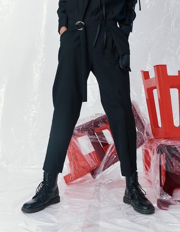 **2024SS《BAN-DOH》**https://images.squarespace-cdn.com/content/v1/568d0036dc5cb4a5b51b342a/f835f9cc-7cbc-42c1-8840-f8a44530976e/24SS%E9%85%B7%E5%8D%A1%E4%B8%AB%E5%AD%97-04.png?format=2500w|**設計**|本季以辦桌作為設計理念,將傳統服飾元素解構再造,勾勒出多款融入「總鋪師」的服裝特色,在正統版型上不斷拆解重塑,承襲品牌擅長「一衣多穿」的解構風格,重塑、解構成具現代潮流的襯衫款式,於本季推出不少品牌經典的無性別服裝。服裝版型將正統西裝褲與較休閒版型的老爺褲解構與重塑,設計上由拉鍊襠部解構延伸出一條綁帶,這條綁帶可以與右邊口袋上解構的鐵環相互連接,使腰部尺寸可以自由調整;此款褲子除了延伸左側褲頭一根活褶一路到褲管來增加視覺層次外,也特意將活褶至下擺從中一刀剪開,讓褲子口袋下擺露出讓層次更佳豐富,而活褶內層則多設立一個帶有機能性的口袋;值得一提的是,此活褶開口處是以西裝袋純式口袋精緻收邊而成,且在活褶與褲身之間加入了暗扣設計,你能自由的選擇將活褶扣上緊貼腿部或解開自然垂墜。此款西裝褲無論是搭配本季解構西裝外套、襯衫系列,都能為整體造型增添正式與優雅感,無論是商務場合或特殊活動,它是一件具有極致的風格魅力的設計款單品。|**靈感**|本季靈感來自於臺灣傳統宴席「辦桌」,辦桌不僅是外燴,更是一趟完整的宴席服務,在每一次的婚喪喜慶、彌月慶生、廟會慶典中,串起人與人的連結,人們想在特殊日子中見一面、聊上一會天,更是在辦桌文化中重要的一環。《辦桌Ban-Doh》除了致敬日漸式微的臺灣文化,更希望能以時尚再現傳統,繼品牌21SS《Connextion》後再次希望現代人重視人與人的連結。服裝版型上也納入季主題特色,將傳統服飾元素解構再造,尤其能看見辦桌文化中不可或缺的「總鋪師」服裝特色,將其標誌性的雙排扣上衣與圍裙樣式,重塑、解構成具現代潮流的襯衫款式;印花以早期辦桌傳統元素作為靈感,融合了大圓桌、紅塑膠椅、燈籠、棚架等形象,解構後巧妙組合,點陣排列出時尚雅緻的經典風格。布花顏色不乏INF的經典暗黑,還使用了傳統茄芷袋中的紅、綠、藍三色,營造出兼具現代感和傳統風格的獨特印象。https://images.squarespace-cdn.com/content/v1/568d0036dc5cb4a5b51b342a/481ae2ea-a86a-4b0b-b2cc-4aa18e897c93/%E6%9C%AA%E5%91%BD%E5%90%8D-.jpg?format=2500whttps://images.squarespace-cdn.com/content/v1/568d0036dc5cb4a5b51b342a/63afe27a-9008-4341-ab5a-755f7d84a79b/%E6%9C%AA%E5%91%BD%E5%90%8D-9.jpg?format=2500whttps://images.squarespace-cdn.com/content/v1/568d0036dc5cb4a5b51b342a/3ddb039c-130e-4915-a978-e18573476474/%E6%9C%AA%E5%91%BD%E5%90%8D-4.jpg?format=2500whttps://images.squarespace-cdn.com/content/v1/568d0036dc5cb4a5b51b342a/a17275ab-07da-4480-bb63-836f1b63bc56/%E6%9C%AA%E5%91%BD%E5%90%8D-3.jpg?format=2500whttps://images.squarespace-cdn.com/content/v1/568d0036dc5cb4a5b51b342a/be45c5cd-eaec-434f-b9a6-988e7705ebbe/%E6%9C%AA%E5%91%BD%E5%90%8D-2.jpg?format=2500whttps://images.squarespace-cdn.com/content/v1/568d0036dc5cb4a5b51b342a/6e706bd4-dac4-440c-a8a0-cfd157f1c9e4/%E6%9C%AA%E5%91%BD%E5%90%8D-5.jpg?format=2500whttps://images.squarespace-cdn.com/content/v1/568d0036dc5cb4a5b51b342a/c8404b39-5bbd-406a-8bed-42dd54eec505/%E6%9C%AA%E5%91%BD%E5%90%8D-6.jpg?format=2500whttps://images.squarespace-cdn.com/content/v1/568d0036dc5cb4a5b51b342a/89542696-2385-4574-973f-66c5a3fce1d5/%E6%9C%AA%E5%91%BD%E5%90%8D-8.jpg?format=2500whttps://images.squarespace-cdn.com/content/v1/568d0036dc5cb4a5b51b342a/620b57e7-79e7-4ab7-8732-3f5044f308e4/%E6%9C%AA%E5%91%BD%E5%90%8D-7.jpg?format=2500w|**材質**|羊毛 40%聚脂纖維 57%彈性纖維 3%|**顏色**|黑|**洗滌方式**|可機洗低溫整燙不可漂白不可烘乾**INF 24SS 臺北時裝週品牌秀**https://youtu.be/qhS-x8GZ-zo?si=P61e773OwPojmvXQ