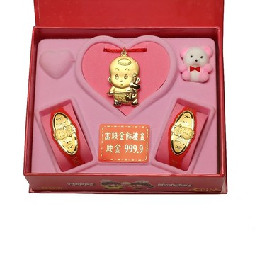 品牌:童樂繪金飾品名:兒童黃金彌月禮盒3件組 (彌月金飾 彌月禮)材質:純金999金重:黃金約重0.3錢配備:包裝盒x1、保證卡x1、手提袋x1