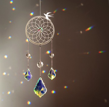 https://www.youtube.com/watch?v=u7plzqRbci0是誰說彩虹只在風雨後?早晨拉開窗簾,陽光灑到這個掛飾上,彩虹和片片光斑就會出現在房間裡。如果恰好有風吹來,掛飾擺動起來,彩虹和光斑也會舞動起來,這一切,只為你心動!在每個有陽光的清晨點亮你的心情,點亮你的生活!在你看到彩虹環繞在房間的那一刻,你心中會響起哪首歌?這款掛飾的靈感來源是「捕夢網」,太陽照在這個捕夢網上,折射出的光斑,彩虹,美輪美奐。熱烈追求,全心投入, 你的夢,我包了!利用物理學棱鏡原理,採用黃銅和水晶折射石精心打造,附帶一根3米長的透明線懸掛線,您可以懸掛在房間內任何照射到陽光的位置。在寒冬來臨,在這樣大環境下,這也是送禮的絕佳選擇,誰不愛溫暖,誰不愛彩虹呢?