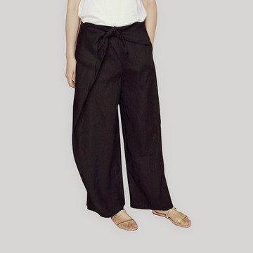黑色麻料不對稱綁結寬褲