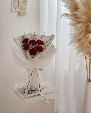 紅玫瑰搭配白色包裝,既經典又充滿浪漫氛圍。很適合表達濃烈愛意,無論是情人節、紀念日,還是求婚,都能帶來心動的感覺。**ʚ 商品介紹 ɞ**花材種類: 日本進口永生花 + 乾燥花商品規格: 40 寬 x 45 高 cm附花束提袋**ʚ HARVEST ɞ**代表著收穫與豐收希望每位收到花禮的人都能收穫滿滿的幸福與感動感受到滿滿的溫暖與愛,並將這份幸福帶回家中,成為日常生活的一部分為您帶來不凋零的美麗,讓這份美好長存於您心中,成為永恆的回憶Every Flower, a Harvest of Love and Joy送花可以不用侷限在特別日子裡送,平凡日子裡一份突如其來的浪漫驚喜,更能讓人心動不已,想要寵愛自己,一束花也能讓你的心情瞬間加分唷!**ʚ 賣場說明 ɞ**• 我們的商品是手工製作的,每一件都有天然花材,因此每件成品可能會有些微差異唷!• 花材的外觀、顏色和大小可能會因批次和季節有所變化。• 如果遇到短缺或品質問題,我們會選擇合適的替代品來保持整體效果。• 照片為實體拍攝,可能因螢幕差異顯色略有不同。• 永生花比較脆弱,運送中可能會有些掉落,這是正常的,我們會細心包裝來保護它們。• 如果收到商品後有任何問題,請先聯絡我們,我們會盡快處理,感謝您的理解與支持!**ʚ 照顧方式 ɞ**• 永生花不用膠水• 避免陽光直曬回事高溫環境• 避免經常觸摸花朵• 請放置乾燥空間 避免接觸水氣• 灰塵可用冷風輕吹或軟刷清除• 觀賞期2-3年 隨著時間顏色會逐漸變淡為正常現象• 有任何訂製需求、商品諮詢,都歡迎聊聊唷~