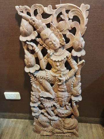 精緻的柚木雕刻藝術品,雕刻了一位姿態優美的女神形象,身著華麗的服飾,頭戴精緻的冠冕,手中握花婀娜多姿。整體雕塑充滿了細膩的紋理和繁複的裝飾,展現了高超的木雕工藝和東方藝術風格。產地:泰國尺寸:60x30公分材質:柚木