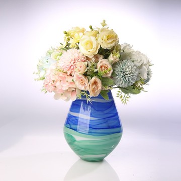 蒼海靈動尺寸:高23cm、寬16cm、瓶口10cm ±0.5cm 顏色:藍色、綠色重量:600 ±0.5公克這件玻璃花瓶的創作理念靈感源自自然界的流動與變化。它的圓潤造型和生動的藍綠色漩渦圖案,展現出如水般的流動感,讓人聯想到溪流與波浪的輕柔。半透明的材質使色彩在光線中交融,創造出深邃的視覺效果,仿佛在講述著自然的故事。這件作品不僅是一個花器,更是一個藝術品,邀請觀者在其動態之美中感受生命的運行,探索形狀與色彩的無限可能。材質:美國Spectrum Glass 96Na20鈉玻璃此作品為全手工吹製,照片即為此實品,此件作品僅此一件,獨一無二。包裝採精緻盒包裝。製作說明:空心吹製,以鐵製空心吹管,撈取熔解爐於1150度的熔爐中,呈現麥芽糖的玻璃膏,並從另一端進行吹氣來撐大玻璃體,吹出所需大小的中空形體,並加以塑形的玻璃製作方式,純正台灣生產製作。https://live.staticflickr.com/65535/52229643522_0e78a397de_k.jpg