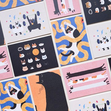 貓咪系列明信片|五入組 定價:250元 一組五入不分售選自過往一些受歡迎的貓咪創作。**以貓咪的方式說愛你**黑貓大概是世界上最難拍的動物之一,卻讓人愛不釋手,兩顆大大的眼睛究竟透露著何種訊息?https://live.staticflickr.com/65535/51678295636_db0bf06419_b.jpg**捲筒衛生紙**我家的貓真的沒這問題,他只對紙箱有意見。但看著網路上與衛生紙纏鬥的貓們,竟然有點羨慕!?https://live.staticflickr.com/65535/51678965904_bf05c02cff_b.jpg**貓咪臉譜**人類溝通使用的機密代碼,你養什麼貓?“橘白”、“胖橘”、“賓士”這種行話只有養貓的人懂啦!https://live.staticflickr.com/65535/51678295766_15faa770d4_b.jpg**好長好長的貓**養到了一隻貓界model,手長腳長靈活的很。好長好長就是他的代表作,專門用來表達不願離開地面的訴求。https://live.staticflickr.com/65535/51678546623_492790359e_b.jpg**奪牌貓咪**2020台灣在奧運有很棒的表現,案子繁忙之餘還是硬要畫了一系列奪牌貓貓療癒自己還有其他人,沒想到頗受好評,決定也納入明信片的收藏。https://live.staticflickr.com/65535/51679175815_3e1c6f8f90_b.jpg印刷 | 獨立版四色印刷 紙張 | 新浪厚卡Snoble:紙張纖維蘊含空氣感,手感溫潤蓬鬆,正面有著微量塗佈層,在平版印刷上能忠實呈現顏色與細節,屬於美術等級的白色卡紙。尺寸 | 10.5 x 14.8 cm注意事項 | 1. 電腦顯色僅供參考,實際顏色請以實際印刷顏色為準。2. 歡迎國外朋友訂購,建議可先與設計師聯繫確認出貨方式再行下單。
