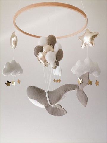熱氣球鯨魚寶寶移動嬰兒床毛氈,海洋中性兒童房裝飾金色