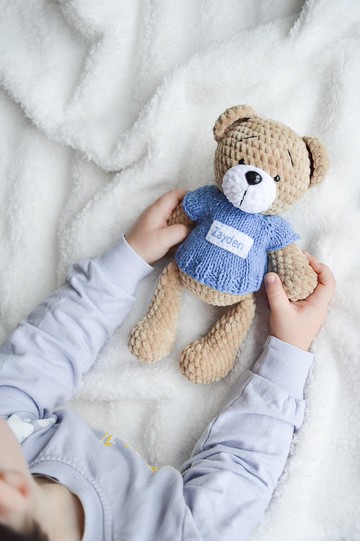 / 材料 /- 優質毛絨紗線(100% Mikropolyester)- 毛衣用棉紗- 安全的眼睛和鼻子- 纖維填充物- 手工作品/ 顏色 /原色是泰迪熊的顏色(米色),副色是毛衣的顏色(藍色)。如果您想選擇不同的顏色,請寫信給我。/ 尺寸 /成品玩具的高度 – 8,6 英寸(22 厘米)/ 關心 /用弱肥皂溶液在溫水中手洗。/ 包裝 /每個玩具都裝在一個帶有“手工製作”標籤的紙板箱中。每個買家的包裹內都有一份小禮物和一張感謝卡。每個包裹都有一個軌道號。