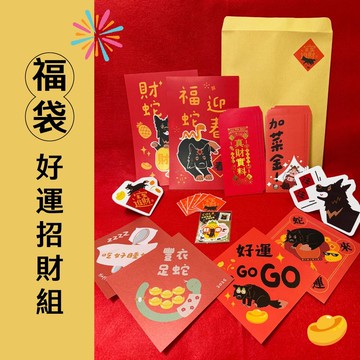🎉 過年前限量福袋來了! 🎉【好運招財組-688】🧧 福袋價值 81 折!搶到就是賺到!🔥 僅限 15 組,手慢無!🛒 售完即止,錯過就等明年!➊ Cola日常所需「好運貼紙」組數量:內含5款,共5張款式:汪旺來、出入平安、萬事ok、吃貨專家、Happy Birthday! 尺寸:包裝7x9cm,單張長寬約6cm材質:4款霧面貼紙,1款亮面透明貼紙➋ 招財進寶 春聯貼紙 6入尺寸:5x5cm材質:銅版貼紙+霧膜➌ 2025蛇年限定春聯|Cola左右護法組2入數量:福蛇迎春、財蛇旺旺,各1入尺寸:長方形 26.5*17 cm材質:單鏡銅210g➍ 2025蛇年限定春聯|Cola蛇來運轉 1入尺寸:15 x 15 cm材質:象牙紙(100g)➎ Cola方形春聯|好運GOGOGO 1入尺寸:15 x 15 cm材質:象牙紙(100g)➏ 2025蛇年限定春聯|豐衣足蛇 × 吃好睡好2入數量:『豐衣足蛇』×『吃好睡好』各1入尺寸:15 x 15 cm材質:銀星紙紅色(120g) ➐ 燙金紅包袋 - 真材實料 3入數量:一份3入內袋尺寸:9 x 18 cm材質:滿天星紅色(120g)➑ 吃飽飽財神爺『加菜金』紅包袋 3入數量:一份3入內袋尺寸:9 x 18 cm材質:象牙紙(100g)※台灣製造※福袋商品售出後除商品本身瑕疵外,恕無法退換貨。※如福袋內品項售罄會替換為等值商品,不另行告知。