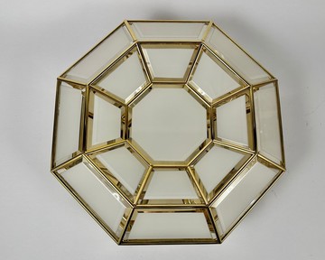 八角形白色玻璃和金色金屬嵌入式吸頂燈或壁燈。這盞燈可能是 20 世紀 60 年代/1970 年代的。它很重,品質很高。部分白色的玻璃具有刻面切割邊緣並鑲嵌。框架由 24k 鍍金黃銅製成。真正的工藝。您也可以將這款特殊的吸頂燈安裝為壁燈。它有一個標籤。 白色玻璃和金色金屬製成的八角形吸頂燈或壁燈。製作精美的手工切割藝術玻璃經過精心拼湊而成,使燈獨特而美麗。 彩色玻璃壁燈是一款豐富而精緻的配件,適合經典和現代的室內裝飾。 所有染色玻璃產品都應使用濕布清潔。 此型號設計使用 4 個燈頭 E27 的燈。 接線工作正常。此接線適用於亞洲、美國、加拿大和歐洲。 方面: 高度:39 公分。 寬度:39 公分。 深度:13公分。 (離牆的距離) 燈狀況良好! 根據物品的年代,金屬上的鍍金有部分損失。 我提供了很多圖片來最好地描述該商品的狀況! _______________________ 客戶的意見對我來說非常重要,所以我總是準確地描述貨物的狀況,並且總是在發貨前討論細節。 我保證您會收到處於最佳狀態的我的物品(有退款保證)。 如果您有任何疑問或需要物品的額外照片,請隨時與我聯繫。 也許您更喜歡在視訊通話中查看項目?請告訴我!我會打電話給您並展示該物品。