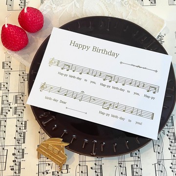 想為喜愛音樂的他/她送上一份特別的生日禮物嗎?這是一張華麗可愛的生日卡,上面印有閃閃發光的「Happy Birthday」樂譜,並以金屬光澤的燙金工藝呈現。這是由樂譜製作專家 Be-Tone 製作的原創商品。以其精緻的樂譜燙金設計、華麗的質感與高級的成品,深受喜愛音樂的顧客及專業音樂家們的讚賞。這絕對會成為一份適合特別日子的、令人難忘的禮物!● 套組內容1. 生日卡 (明信片尺寸 / 148×110mm) ・ 燙金處理 ・ 背面可手寫訊息,作為留言卡使用。採用厚紙印刷,背面不易透字。2. 白色信封 (洋式2號 / 162×114mm) ・ 雙面皆為素面 ・ 厚紙材質,內容不易透出3. 火漆封蠟貼紙 ・ 收到瞬間即引人注目,令人喜悅 ・ 本店原創!以李斯特的浪漫鋼琴曲「愛之夢」樂譜為背景,優雅的 G 譜號若隱若現,設計細膩。 ・ 每枚皆為手工精心壓製而成● 推薦使用場合!・ 生日派對、慶祝活動、驚喜・ 特別的日子 (生日求婚、新生兒誕生、祝壽)・ 正在演奏或學習樂器的人 (歌唱、鋼琴、吉他、小提琴、長笛、薩克斯風、小號、單簧管、大提琴等管絃樂器)・ 吹奏樂團或室內樂團成員、音樂高中/大學生及畢業生・ 贈送給お世話になった先輩、指導老師・ 贈送給音樂教室的學生・ 贈送給音樂老師、鋼琴家、音樂家・ 贈送給音樂愛好者 (喜愛鋼琴、樂器、古典音樂、音樂收藏家)● 火漆封蠟貼紙注意事項尺寸與色澤可能略有差異,請享受手工製品獨有的質感。請避免陽光直射、高溫潮濕的環境,並存放在陰涼處。若直接投入郵筒,恐有破損風險。建議額外加強保護,並選擇較快的郵寄方式。