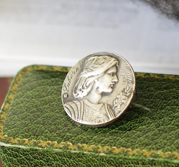 人像為法國國民英雄-聖女貞德( Jeanne d'Arc,1412年1月6日—1431年5月30日),關於她的歷史會放在文章最後。銀質,有厚度,狀況不錯背面是老式的C形扣環(C clasp)及老關節(T bar hinge),這兩種設計從18世紀就有了,後面才繼續改良成近代的扣環。所以有看到這種老式關節都可以辨別年份哦。尺寸是2.5公分。此別針的背面長針比較長,截至目前為止的買入、賣出經驗,年份較長、老一點的別針都長很多,會附上軟塞給買家使用。最後,關於聖女貞德:一位出生於農村的小少女,因為英法百年戰爭中她帶領法國軍隊對抗英格蘭王國軍隊,最後被捕並被處以火刑。 是法國的國民英雄。古董飾品因為年份關係,請使用完後,放到夾鏈袋保存。勿戴著淋浴、游泳等水上活動。正常使用,壽命久久。