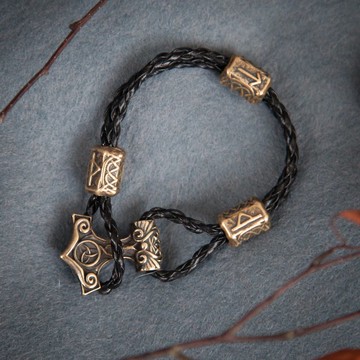 以維京時代風格設計,採用黑色編織皮革繩搭配黃銅索爾之槌與符文珠飾的手鍊。手鍊上飾有古弗薩克符文,此套符文能為配戴者帶來守護。您可從最後一張圖片中選擇您喜愛的符文訂製飾品。我們選用高品質金屬手工製作此飾品,並以細膩拋光與手工燻黑處理。我們將根據您的手圍製作任何尺寸的手鍊。索爾之槌尺寸:高 2.6 公分 (1.02 英吋)寬 2.4 公分 (0.94 英吋)若有任何疑問,歡迎隨時聯繫。