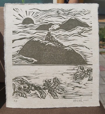 藝術家: 許以璇作品名稱:阿里山日出媒材技法:油印木刻版畫心尺寸:13x15cm年代:2021版數:限量版數200張,隨機出貨產地/製造方式台灣/手工印製作品介紹:阿里山小火車在雲海之中探出頭來,瀰漫的煙和雲海融為一體,刻畫出作者對嘉義阿里山日出的印象。木刻版畫(Woodcut )是指木板上,以雕刻刀、鑿等工具將木板刻掉,將需著色部份(凸面)保留並滾上顏色,印刷所得到的就是凸面的圖像。木刻版畫是發展最早、歷史最久的版種,具有獨特的刀刻味與木紋。