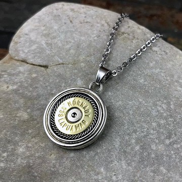 Bullet Designs Inc. 成立於美國洛杉磯,為溫徹斯特軍火武器公司(Winchester ® Repeating Arms Company)唯一正式授權單位,產品均以真實回收子彈(無火藥)、彈殼...等,設計各式飾品配件、生活用品,其產品的風格兼具美式陽剛與復古情懷的浪漫性格,自推出即大受好評,獲得許多時尚潮流媒體雜誌推薦,為穿搭必備單品之一。採用「.338 拉普麥格農 Lapua Magnum(8.58 x 70mm) 狙擊步槍子彈」做為項鍊墜飾,搭載於復古鎳銀靶心繩合金項鍊。- 吊墜直徑約 2.35cm。- 附原廠盒裝。* 請勿用於非法用途或改裝,若造成任何法律問題或風險,須自行承擔。