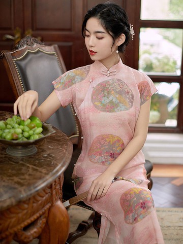 【粉】新中式復古中國風 拼紗收腰旗袍