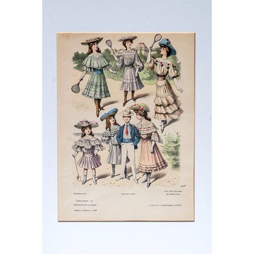 【圖1 - 圖3 為原件圖】【圖4 - 圖9 為示意圖】【含雙層卡紙裝裱 (不含框) 如示意圖 4, 5, 6】作者:不詳署名:【時尚畫報】(Le Moniteur de la mode, 1843 – 1913)。技法:石版,手繪上彩。年代:1904.07.30。尺寸:36.8 x 28.3 cm(畫面 ) / 40 x 50 cm(含卡紙)。備註:含卡紙裝裱 (不含框)編號:P-F-0501830年代後,一種新型態的刊物在歐美問世,訴求時尚穿著,因為新的中產階級出現,時尚逐漸蔚為風潮。這種呈現當時人穿著與流行服飾的刊物,需要大量插圖,因而插圖製作成了表現時尚的重要工具。此時的插圖製作藝術家,透過不同的版畫技法,如銅版直刻、蝕刻與石版等,完成許多圖版,再一一手繪上彩。時尚的流行與變化,隨著時尚畫報的出現與逐漸普及,和社會文化與品味有更進一步的結合。1870年代左右,畫報的開本又有了變化,四開已無法滿足市場的口味,對開(約A3)的尺寸成為市場大型畫報的主流,室內擺設細節更加豐富,模特兒的動態也多了細膩。這張畫報插圖,呈現當時的運動時尚,雖然以年輕孩子為主,亦可想見當時整體追求運動之際的舒適,捨去襯裙與繁複的裝飾,不過仍保有流行的時尚細節,帽子成為焦點,藉以避開戶外的陽光。*有任何細節問題歡迎發訊聯絡設計師*本設計館商品主以西洋古董、舊首飾家居飾品、歐洲老原件版畫為主,老件商品難免有歷史歲月的痕跡,但以個人的品味巧妙安置,各司其位,可促成不凡的生活品味與美學理念。然介意者仍請先慎重考慮再下單。