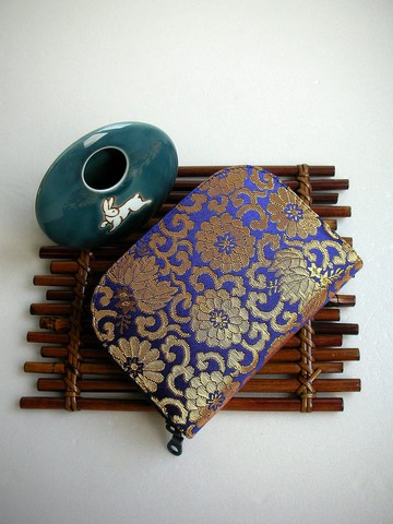 京西陣-京都西陣織出的高級絹織物總稱.金襴-錦緞織錦面料.布紋浮雕華麗波峰中納入黃金線為名.舉凡寺廟僧侶.歌舞伎服飾.戲劇.婚禮等.乃日本文化不可或缺.商品材質:寶藍光亮錦織襯底.厚實金線織繡富麗菊唐草.高貴大氣~+藍染素色棉裡布.商品規格:長13cm+寬10cm+厚2cm內部配製:兩旁各一層鈔票隱藏格(計2格)+3層卡片格(計6格)+中間1個拉鍊零錢袋.兩旁各1格放置發票.刷卡單.便條等.商品使用注意事項:髒污請以牙刷沾(洗衣劑稀釋)輕刷.再以潔濕布清潔.潔乾布吸水自然晾乾.產地/製造方式台灣手工製作