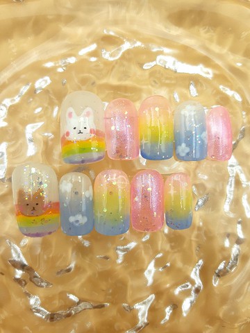 在彩虹上奔跑著,來自不同星球的兔兔與熊熊✨yumeko的作品為手工繪製,因此商品圖案會有細微不同,每樣商品都是獨一無二的。甲片尺寸都是用捲尺測量的,請買家用捲尺測量尺寸後符合再下單!!甲片為規格化固定尺寸,不是量身訂做,故有些許誤差,因此在尺寸沒有的情況下,會依最接近的尺寸製作。因為指甲弧度關係,甲片無法完全貼合、尺寸有些微誤差是正常的現象😊下標前請確認尺寸,尺寸不合無法退回,敬請見諒🥺