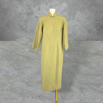 二手 古董訂製 橄欖綠 毛料 開衩 厚重 七分袖 旗袍 CA404