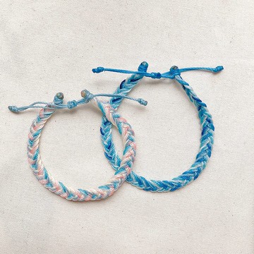 [甜蜜情侶] __驚喜包介紹__:與他度過的第一個夏天記憶深刻,更期待與他度過未來的每一天。不同個性的我們,卻又從共通點中找到彼此的相同之處,情侶間的緊密與愛戀,可以用粉嫩又平和的「戀愛夏天」來表現。__驚喜包內含__:-\t一條#戀愛夏天-粉色款式手環,配色:白+奶油+水色+水藍+灰綠松石色+淺鮭紅+霧玫瑰色+蘭紫,寬度:0.6 cm。-\t一條#戀愛夏天-藍色款式手環,配色:粉藍+灰綠松石色+水藍+水色+白色+漸層藍色,寬度:0.6 cm。-\t手環配色皆固定,無法自選。-\t手環收尾方式可自選。-\t需提供緊貼手圍cm(伸縮收尾亦需要提供)。**一律販售手環,固定配色,無法自選配色,但手圍訂製,需於訂單備註中註明兩條手環的緊貼手圍/製作長度cm。**-備註:1.**下單時請於備註中註明緊貼手圍cm**2.緊貼手/腳圍測量方式:使用布尺/線/細長紙條,緊貼(也不需要太緊,輕輕貼著即可)的繞著您想要配戴手/腳環的手/腳部位置一圈,觀看布尺上緊貼您手/腳圍的長度,或量測該線段/細長紙條符合您手/腳圍的長度,即為緊貼手/腳圍。3.商品製作後的總長為緊貼手/腳圍長度+1.5 cm,會酌加黃銅/純銀圈,提供您做些微調整。4.如有習慣的配戴長度,也歡迎直接於備註註明。-注意事項:1.商品皆屬於純手工製作,故每個商品之間都會有各自的獨特性,也可能會與商品照有些微差異。2.平均出貨日為:下單後10-14個工作天出貨。3.有任何顏色搭配,或客製需求,請先連絡設計師。-飾品保養:1.南美蠟線材質配戴約一周後,會逐漸褪蠟,顏色色澤會更加光亮,屬正常現象。2.如含有純銀/黃銅配件,長時間不配戴請存於夾鏈袋中保存。3.商品皆可長久配戴且可日常碰水,唯黃銅配件易氧化,可使用下方牙膏清潔法處理。"牙膏清潔:若黃銅配件表面有氧化情況,可微沾水後塗上牙膏靜置約15分鐘,再稍微用手指/柔軟刷毛的牙刷搓磨洗去牙膏,即可。"4.泡溫泉或使用強烈的化學用品時,盡量將商品取下。-修改:1.如屬於商品本體直接斷裂,則不提供修改服務。2.如屬於商品長度需要修短,或其他需要修改的狀態,請聯絡我們,並提供現況照片,討論後續的修改事宜,可能會需要酌收材料費用。-更多我們:歡迎追蹤FB、instagram,搶先收看更多第一手訊息,以及更多製作花絮。Facebook : 左編右編 Plait WeInstagram : plait_we