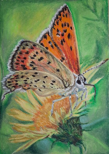 蝴蝶畫。昆蟲藝術。標題“明亮的蝴蝶”。這是一幅原創油畫棒畫。它畫在一張特殊的蠟筆紙上,尺寸為 21 x 29.7 公分。 (8.3 x 11.7 英吋。)藝術品以未裝框的形式出售。交貨:安全包裝以提供保護。帶有追蹤功能。