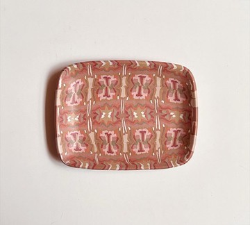 絞胎,意指不同顏色土的組合,用不同色的土把圖案如花壽司般拼組成一長柱狀,一片片切剖開來,會得到數片相似圖案的土片,捏塑成盤。使用絞胎技法製作的器皿有其特色,圖案是正反兩面都有,由於是絞胎方式製作,圖案在製作過程中會因為拍打、擀平而產生自然的圖案變形,有著歪斜、扭動的改變,如同圖案扭動著!使用日本瓷土製作,1230度燒製。15.5*12*1.8