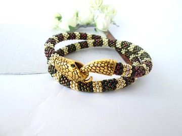 奇妙的神秘蛇 - 為奇妙和神秘事物的粉絲準備的手鍊。印花、蛇紋、蟒蛇的使用仍然很流行。它總是看起來時尚而時尚。手鍊項鍊由 11/0 尺寸的優質日本珠子製成 - 豪華的綠色、黑色、金色、銀,也有一些帶有金色的珠子。手鍊項鍊配有方便的蛇頭和蛇尾扣環。項鍊或手鍊是通用的,它可以作為手鍊或短項鍊兩圈使用。您也可以根據需要製作任何長度或顏色。給我發電子郵件。---厚度 - 0.2 英寸手鍊長度:16 英寸