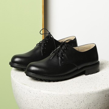 黑色 真皮綁帶寬楦厚底德比鞋 女鞋 皮鞋
