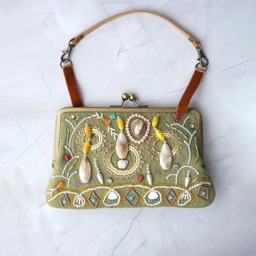 這是一款附有提把的方形口金包。尺寸剛好可放入存摺或護照,也能收納飾品或化妝品等小物。不僅適合日常使用,也非常適合短暫外出攜帶。由於在表布與裡布之間加入了鋪棉,因此觸感蓬鬆,同時兼具耐用性。內裡使用麂皮絨質感氈布,觸感也十分迷人。材質:羊毛、珠飾等珠飾以強力膠固定,不易脫落。尺寸:口金:約 7.5 × 18 公分整體:約 12 × 20.5 公分(不含口金,寬度以底部測量)提把:約 37 公分注意事項:由於縫製與材質特性,絲絨緞帶、外層布料及口金周圍可能產生細微皺褶或痕跡。雖然不影響使用,但若您在意,請勿購買。此外,恕不接受退貨。請注意,摩擦或雨水可能導致材質起毛或珠飾褪色。包裝:免費提供。若有需要,請告知。其他:由於亦在其他平台販售,若訂單重複,將優先處理先下單者。感謝您的理解。禁止事項:請勿擅自轉載照片或文章,亦請勿轉售(包含改製或作為零件使用)本作品。