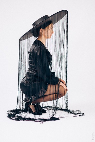 黑色綴飾寬簷帽。蓬鬆的寬簷帽,綴飾垂至地面的流蘇。