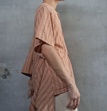 Rebirth collection日本圍裙改制製方型版雙面穿罩衫原長袖改短寬袖脇邊剪裁拼接三角布塊提升設計層次垂墜感改修短衣長下擺製作成口袋手感柔軟親膚性極佳的混紡纖維,穿在身上自在舒服,給妳一整天的好心情Material by小花格紋日式圍裙材質:綿&聚酯纖維混紡