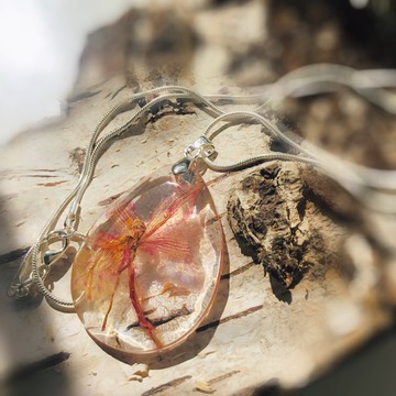 以真實壓製乾燥的鏽色蘭花,搭配高品質環氧樹脂製成的蘭花墜飾項鍊,925純銀鍊長45公分。