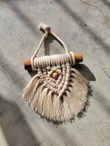 使用肉桂棒製作的小型Macrame編織壁幔,除了靠近聞有肉桂棒的淡淡肉桂香之外,重量非常輕巧,使用紙膠帶就可以輕鬆黏在牆上,不用擔心沒有掛勾或在牆上留下痕跡,輕鬆為家裡增添波西米亞風格的浪漫吧!大小約10*11cm(不含掛繩)注意事項:1.使用天然棉線,上面有黑色點點為棉花籽屬正常現象2.純手工編織,不會像機器生產100%完美,不介意者再下單喔~3.肉桂棒形狀自然無經過加工,可能會有斑點斑紋或裂痕,也會有肉桂味,能接受者再購買喔!