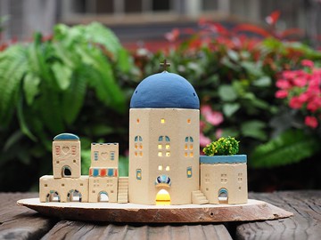 手繪地中海花園燈屋8件組-(小圓頂教堂含LED燈x1+花器含手工植物x1+房子x3+迷你小樓梯x2+木頭底座x1) 接單訂製小花器的植物可改放乾燥花.空鳳.香草.迷你多肉(水苔)等..(花園可隨四季變換花草)/小花器為中空,沒有底部.可自行排列組合,設計自己的地中海小街道,藍色圓頂教堂與白牆映照著海洋,悠遊其中讓人心情愉悅~屋瓦都是手工刻劃和慢慢彩繪上色,經過1230度高溫窯燒,呈現如岩石般的質感,有手感的溫度,可水洗, 也可滴精油當擴香石, 建材好, 可百年保存,具收藏價值尺寸: 小房子每件約 長 2 cm~3.7 cm x 寬 2 cm~ 2.5 cm x 高 3 cm~6.2 cm, 圓頂教堂:12x6.5 cm (小房子高矮胖瘦都有, 再加上手工和燒窯收縮, 尺寸每個都不同,四面都有窗哦!)小房子裝可愛為個人工作室,未達開立發票標準,且無營利事業登記證明,無法開立發票,若有需要,小房子裝可愛可以提供簡易的收據,造成不便,敬請見諒.