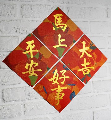 **🐎馬年特別套組.款1【馬上.平安.大吉.好事 彩色小春聯】🐎 單張/套組 ****🐎套組可選: 馬上/加馬/金馬/駕到/立馬/神馬/立馬🐎 **手寫非燙金,聯手設計師以[蘋果.桔子.柿子]喜慶設計的春聯底圖,彩色印刷採用220g厚卡美術紙平整硬挺。金色濃墨在佈滿顆粒紋的表面閃耀、筆觸清晰、蒼勁有力。在傳統通紅春聯紙外,提供另一種創新又鬧熱活力的選擇!** 🔶 商品規格**▨ 單張$100 / 四入套組100*95折=$380▨ 每單張尺寸約15.5X15.5cm▨ 套組可搭選 : 馬上/加馬/金馬/駕到/立馬/神馬/立馬▨ 楷書金墨書寫,如需改黑墨請備註▨ 客紙款:可客製2小字或1個大字(不提供合體字訂製)** 🔶 用紙工藝**▨ 220g厚卡美術紙, 表面微粒細紋觸感, 硬挺平整不捲曲▨ 表面顆粒細紋,突顯濃金墨閃耀的喜氣** 🔶 書法X設計**▨ 張貼一整年名家墨寶藝品,為每一天的生活帶來溫暖美好▨ 獨家彩色春聯設計,另一種創新的揮春選擇▨ 照片因每人的手機.螢幕顯示不同, 色調會有些微差異/////////////////////////////////////////////////////////**🔶 馬年手寫春聯 紅包 新品上架中, 歡迎來設計館逛逛 **https://www.pinkoi.com/store/jjhart▨ 大七字 美術紙春聯 | ▨ 小七字 美術紙春聯 | ▨ 超大四字 美術紙春聯 | 超厚萬年紅宣春聯 | ▨ 四字 彩色卡紙春聯 | 美術紙春聯 |▨ 小四字春條 美術紙小春聯 | ▨ 小四字書籤 美術紙小春聯 | ▨ 小斗方 二字.合體字 彩色卡紙春聯 | 超厚萬年紅宣春聯 | ▨ 大斗方 四字.合體字 美術紙春聯 | ▨ 口金包紅包袋 招財口金錢母袋 | ▨ 萬用寫紅包袋 自己描寫紅包袋 | /////////////////////////////////////////////////////////