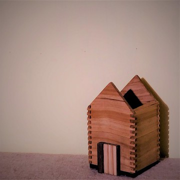 2020年國產材木作生活節參展作品2021年小木器快閃店線上展覽作品 柳杉小屋收納擺件,以where we belong, 「歸位」為概念,替使用後要放回去的東西做了「家」。例如對於筆來說,就是where pens belong. 系列作品呈現了數種房屋的抽象造型,配合指接榫結構,有的作品試圖營造磚屋砌磚時交錯堆疊的特色,有的作品保留榫頭突出處呈現高低錯落之美。主要技法為3mm指接榫的應用變化。以圓鋸台配合治具,一刀一刀精準地切出間隔3mm的指接榫。 有一個可以回去的地方,就是「家」,就能「歸位」。重要的物品應該放在合適的地方妥善保存,如同發自內心的初衷要好好被珍重。Where We Belong 這件作品是作者透過重複一步步的製作過程,尋回當初被木作感動的初衷。留在作品裡的心意,都是對往後放置之物的祝福。