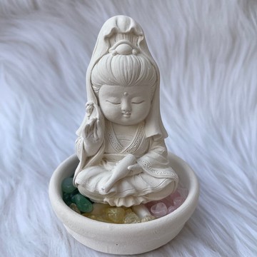 淨念吉祥小佛之寶瓶觀音 - 擴香石具吸濕防潮性佛偈:"世人多重金,我愛剎那靜; 金多亂人心, 靜見真如性。"書案的一角, 放上一尊小小的吉祥佛, 伴你靜思淨念. 搭配檀香精油或乳香精油, 讓沈定的香味幫助心安神閑. 產品材質以擴香石為主, 另加入石粉及珪藻土, 強化材料硬度,增加吸濕效果. 配套含- 天然五行水晶礦石, 小佛公仔, 珪藻土小盤 小佛尺寸Size: 2 3/5" x 1 1/3" x 3 1/2"Size (cm): 7.0 x 6.0 x 8.8擁有超過40年的雕塑技藝, 無論在人物表情或衣著細節的呈現, 都精緻到位. 商品全程手工製作, 展現手作樸實質感與機器量產般的生硬物件大異其趣. 小佛放置在小圓盤, 滴上精油或香精,放在書房一隅; 當思緒沈澱, 心神安寧, 望著小佛的靜定神情, 為忙碌一天的心寧帶來安慰. 擴香石原理 - 擴香石是屬多孔隙的材質, 滴入香精或精油前, 建議可以噴上一點水分, 當擴香石中的水分慢慢發散時, 就會把香氣一併散發出來. 因此擴香石是靜態緩慢的散佈香氣, 和插電或利用熱能的蒸氣式擴香儀不同. 喜歡居家裝飾的朋友, 可以禪園裝飾的風格來打造居家一角; 都市生活, 很難有一大片庭園空間; 縮小版的禪園, 不失園藝樂趣. ** 補充說明, 尺寸明確說明在上面, 這款體型較小, 請詳細查看尺寸, 再下單. 商品全程手工製作, 難免有氣泡的小狀況, 還望體諒, 謝謝 !P.S. 任何來自外國的訂單, 請留意, 需要自行留意進口關稅; 本銷售金額不含國外稅金. Any order from overseas, please be aware of your import tax. This price is F.O.B. Taiwan. And, tax outside Taiwan shouldn't be counted. 台灣