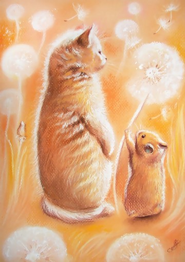 標題 獻給你尺寸:80 公分 x 70 公分(31.5 英吋 x 27.5 英吋)在這幅溫馨的布面油畫中,一隻可愛的小貓和一隻倉鼠結成了不可能的友誼,它們一起站在蒲公英地裡。這幅原畫是在義大利帆布上用油畫完成的。作品的色調以溫暖宜人的 "甜點 "色調為主。畫布上的打印畫是在高質量的設備上製作的,如果需要,還可以用顏料手工繪制。